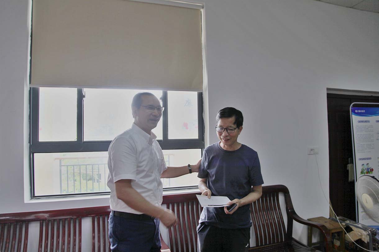 施董一行在东吴镇党委委员、副镇长钟维红等领导的陪同下赴受灾现场,查看灾情。钟副镇长表示,在东吴镇童一村干部群众的共同努力下,此次台风灾害没有造成人员伤亡,但绝大多数村民住宅遭遇了水淹,造成大量经济损失。斐戈集团知悉后当场捐款10万元,用于帮助童一村村民恢复灾后重建工作,童一村书记史良善代表童一村村民们对此表达了诚挚的感谢。