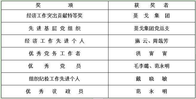 斐戈集团荣获“经济工作突出贡献特等奖”、“先进基层党组织”、“经济工作先进个人”、“优秀党务工作者”、“组织纪检工作先进个人”、“优秀党员”、“优秀议政员”等荣誉称号。