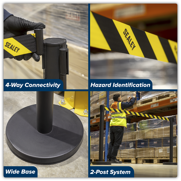 • TWO POST SYSTEM – Includes two posts (Height: 480mm, Base: Ø320mm). • RETRACTABLE BELT BARRIER – Quick solution for restricting or cordoning off the area when operating on high voltage systems. • EASY HAZARD IDENTIFICATION - Retractable black and...